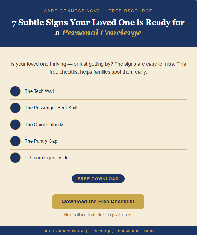 We created this free checklist to help families in Northern Virginia spot the subtle shifts that signal a loved one may be ready for a little more support — and what to do about it.